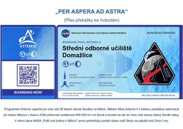 Zapojením do projektu „Pošli své jméno k Měsíci“ se SOU Domažlice stalo symbolickou součástí této historické události. Název naší školy byl uložen na speciálním paměťovém médiu, které je součástí kosmické lodi Orion.